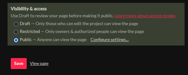 While your game is in Draft mode, you can share the game with the Secret link that you can copy under the red "Draft" label on game's page. Once you're ready to fully release your game, click the Draft label at the top of your game's page, and then select "Public" option in the highlighted "Visibility & access" panel. Click Save β and you're done!